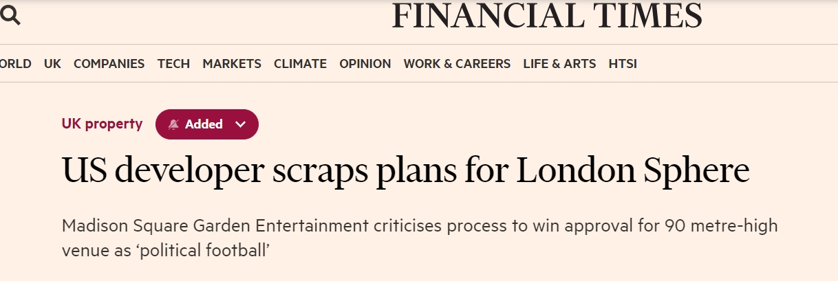 - 在遭到伦敦市长萨迪克·汗(Sadiq Khan)的拒绝后,美国开发商取消了在伦敦建造拉斯维加斯“巨型球”复制品的计划…