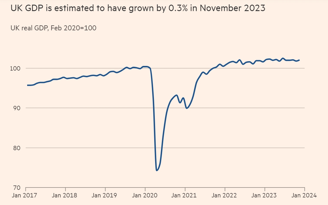 官方数据显示,英国经济在2023年11月出现反弹,增长0.3%,强于经济学家预测的0.2%的增长。