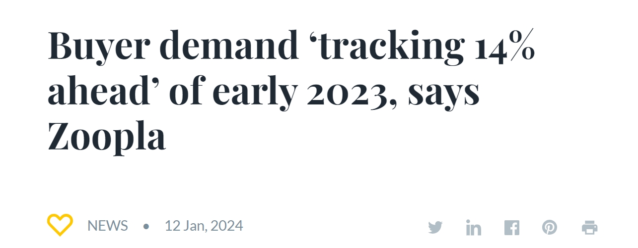 - Zoopla的数据显示,今年1月份第一周,买家需求比2023年初同期增长了14%,而新达成的销售量增长16%…