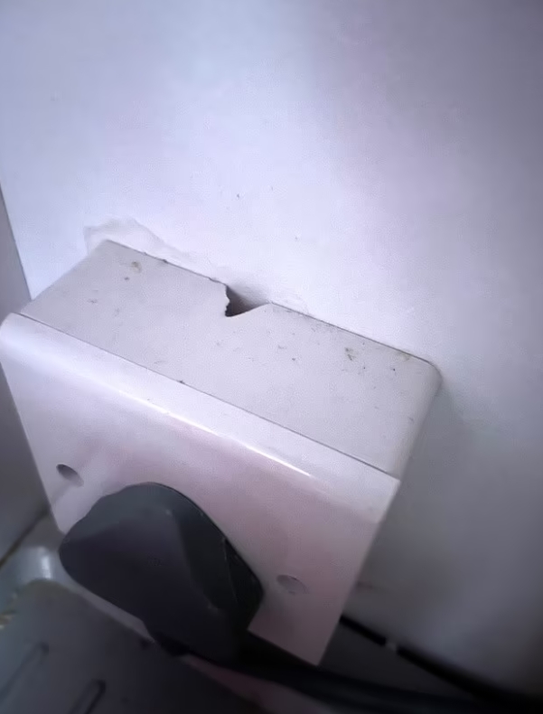 还有电源插座直接裂开了,存在着巨大的安全隐患。