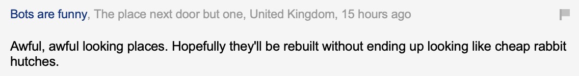 这些地方看起来很糟糕。希望它们能被重建,而不是最终看起来像廉价的兔子窝。