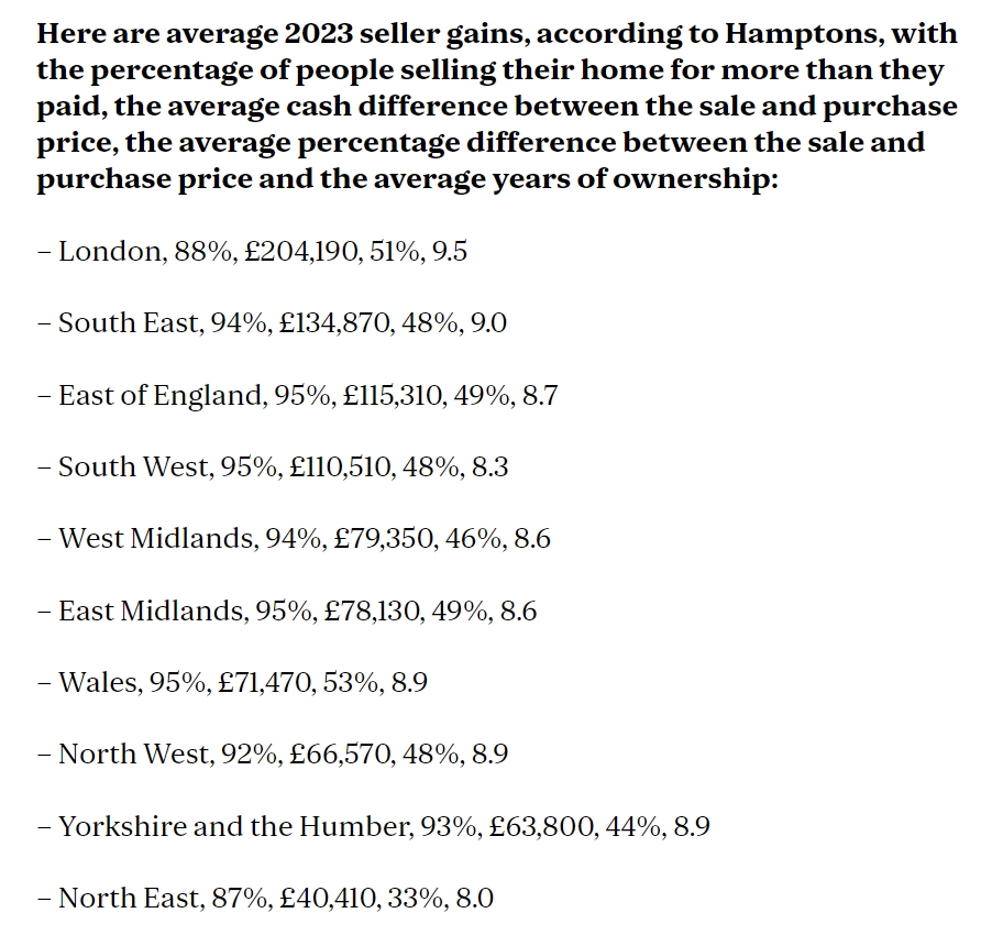 - Hamptons的最新研究发现,2023年,英格兰和威尔士的房主在卖房后平均赚取了10万镑,伦敦一地房主平均赚取68万镑…