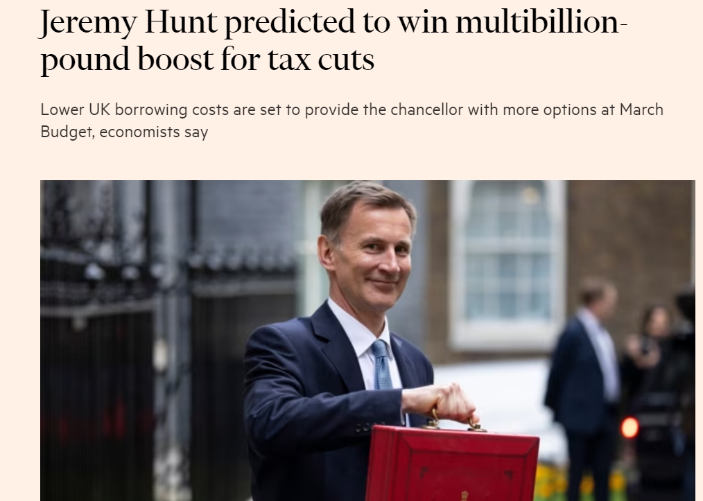 据经济学家预测,英国借贷成本的降低可能会给亨特的春季预算带来更多的财政空间,为削减所得税或进一步减少国民保险费铺平道路。
