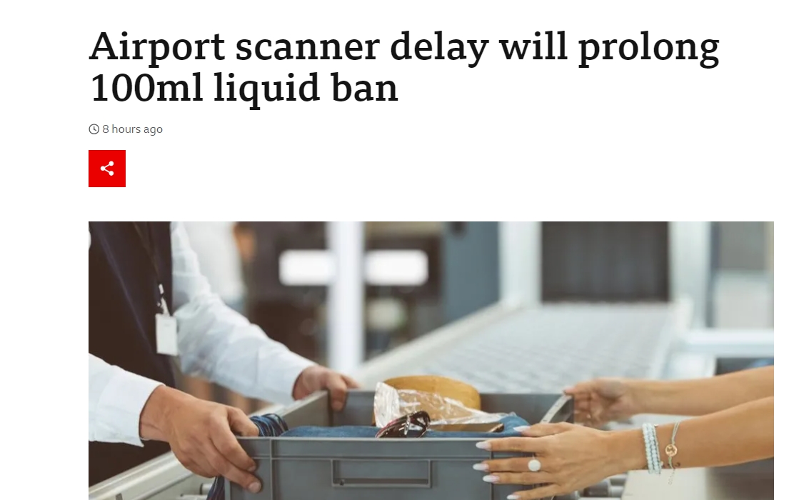 - 据媒体报道,由于新的先进安全扫描仪尚未准备好,英国机场的100毫升液体安全禁令预计将被延长…
