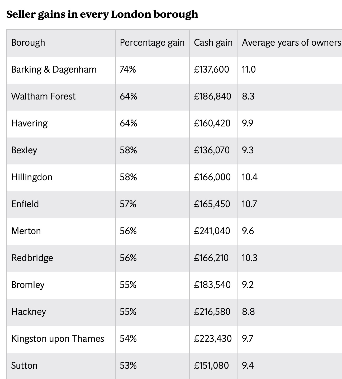 其中,肯辛顿和切尔西的房主,赚取了最大的利润,平均持有10.8年,房屋价值增加了52%,房屋价值增加了680,580 英镑。