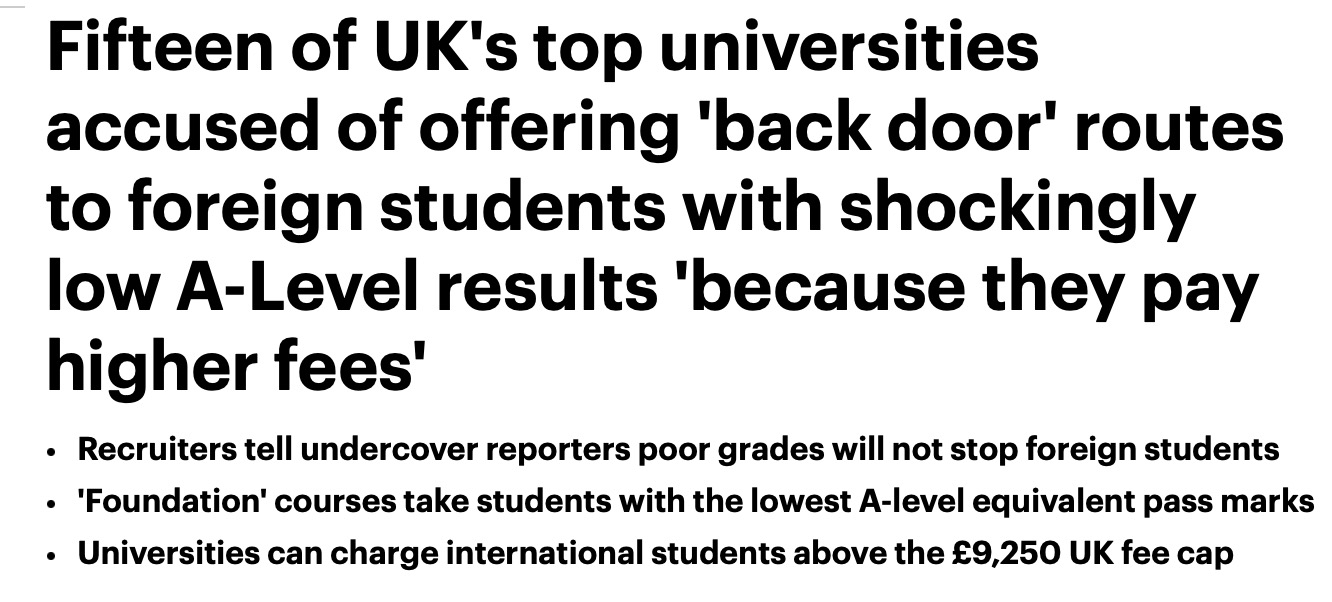 - 据每日邮报报道,英国15家顶尖大学被指控向A-Level成绩低的惊人的外国学生“开后门”。因为他们支付了更高的费用。