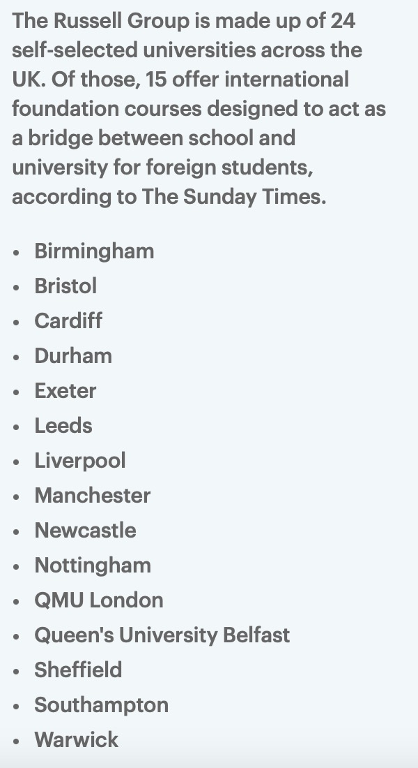 据《星期日泰晤士报》报道,罗素集团24所学校中,有15所学校提供国际基础课程,旨在为外国学生提供学校和大学之间的桥梁。