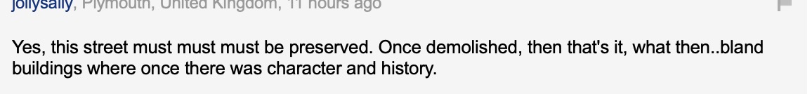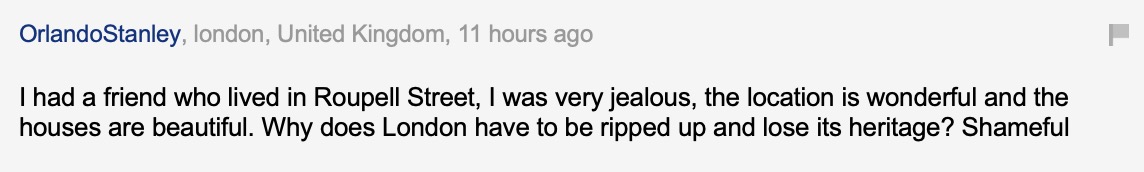 我有个朋友住在Roupell街,我很嫉妒,那里的位置很好,房子也很漂亮。为什么伦敦一定要被拆毁,失去它的历史遗产?可耻……