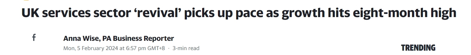 最新调查显示,英国服务业复苏步伐加快,一月份商业活动增速为八个月来最快。
