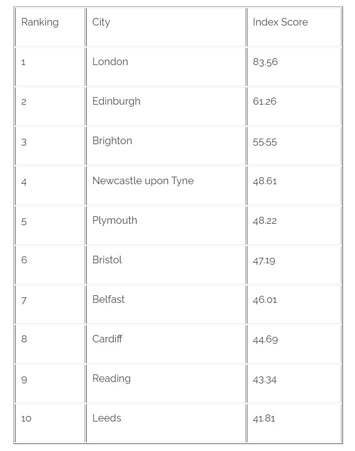 爱丁堡和布莱顿分列第二和第三位,得分分别为61.26和55.55。