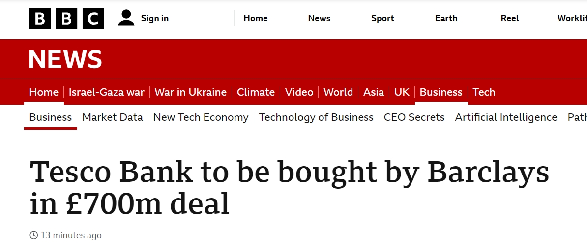 据报道,巴克莱银行将以价值7亿英镑的价格收购超市巨头Tesco的零售银行业务。