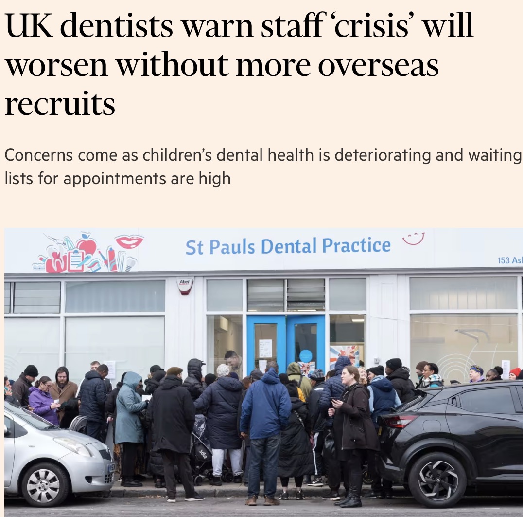 - 英国牙科监管机构警告称:如果没有更多的海外招聘,员工短缺危机将会恶化。