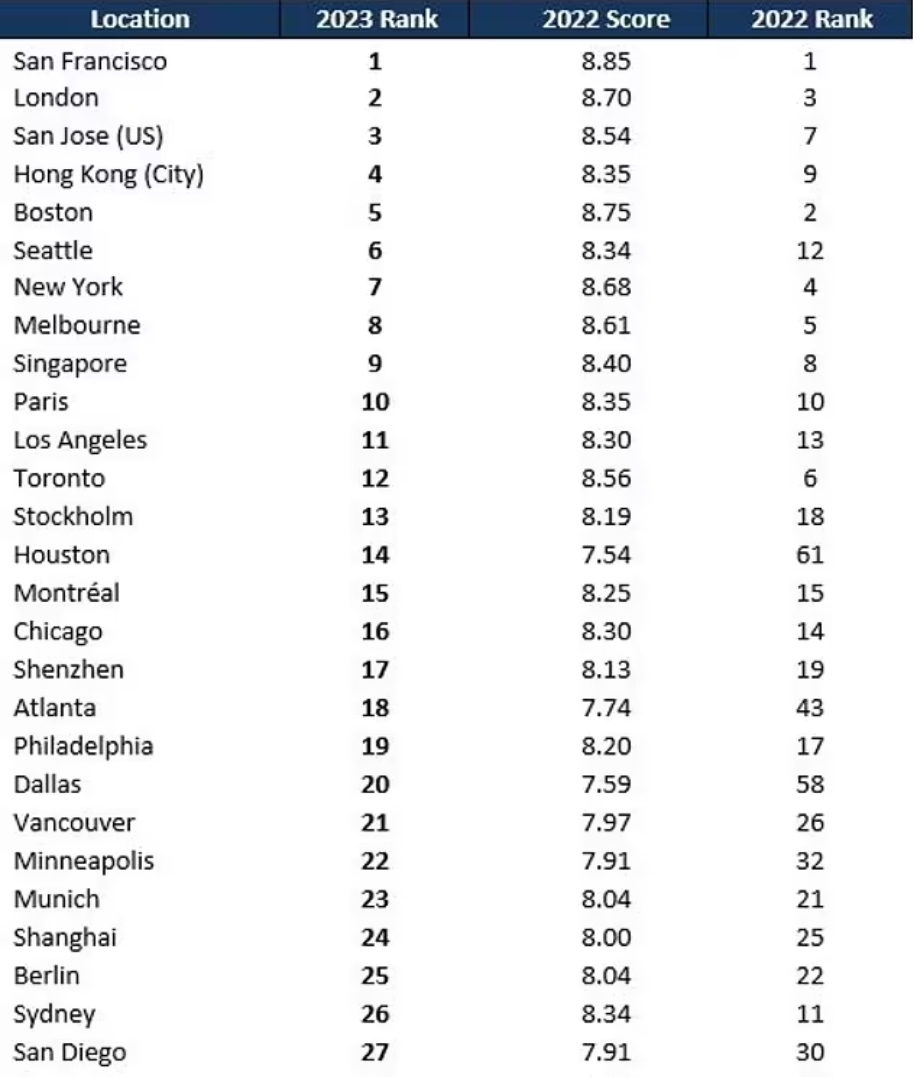 在Schroders的排名中,伦敦得分8.7分,仅次于美国城市旧金山(得分8.85分),并领先于排名第三的美国圣何塞(得分8.54)和排在第四的中国香港(得分8.35)。