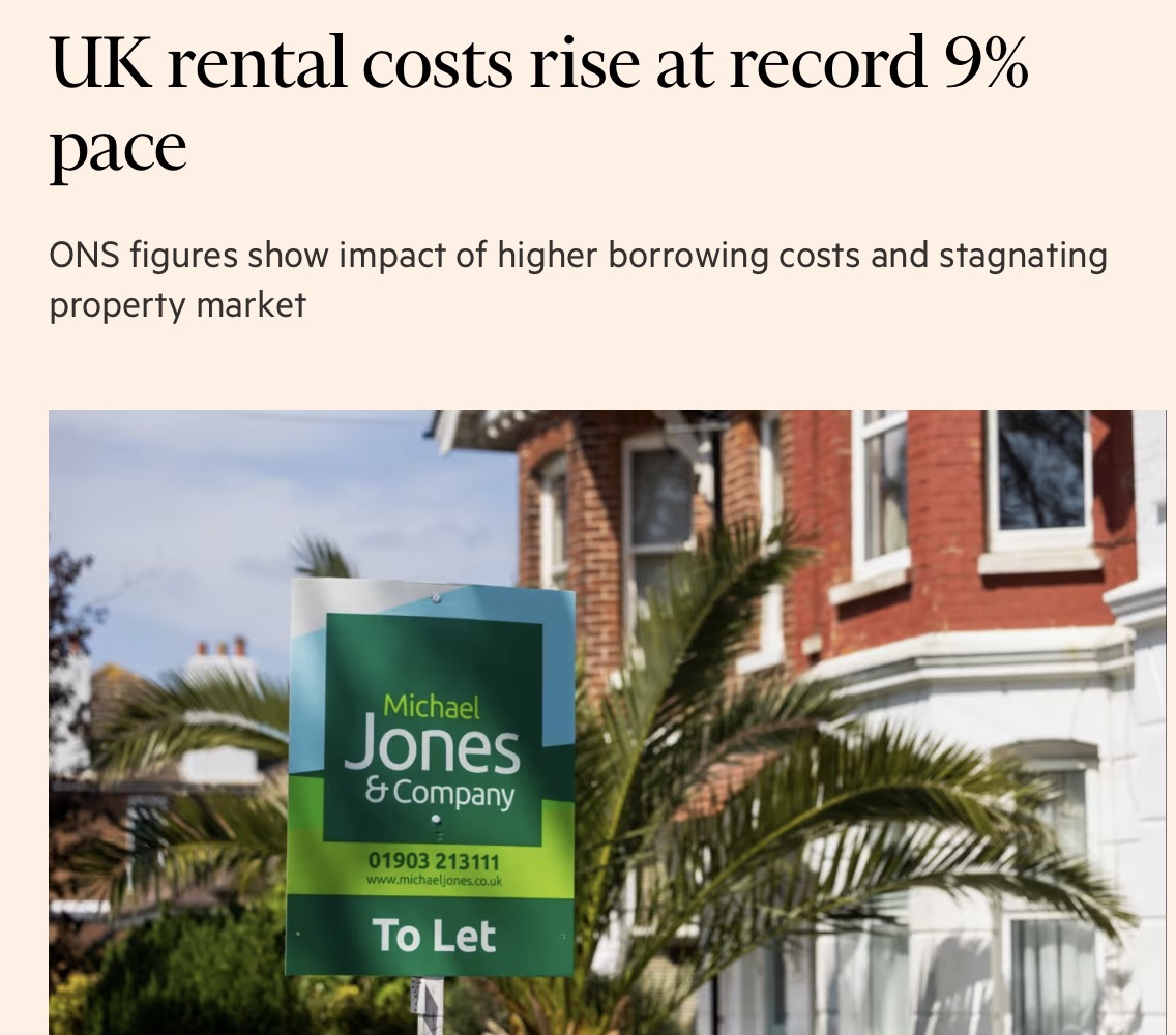 据金融时报报道,国家统计局数据显示:上月,英国房租年涨幅以创纪录的9%的速度上涨。相比之下,1月份的涨幅为8.5%。