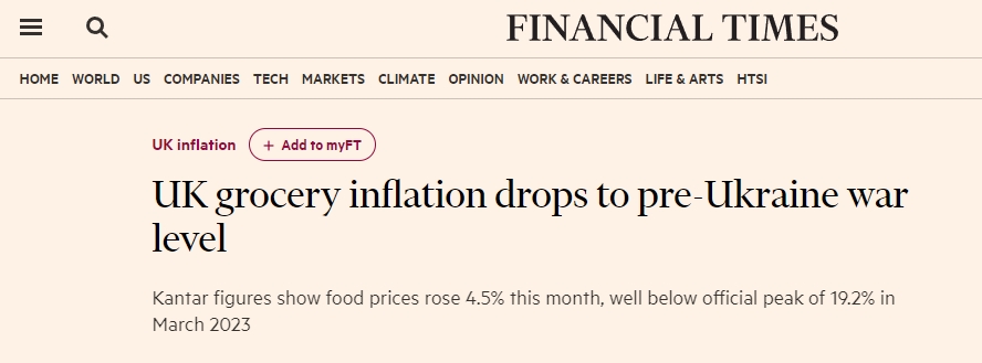 Kantar的数据显示,英国食品杂货价格通胀率已降至4.5%,为2022年2月以来的最低水平。