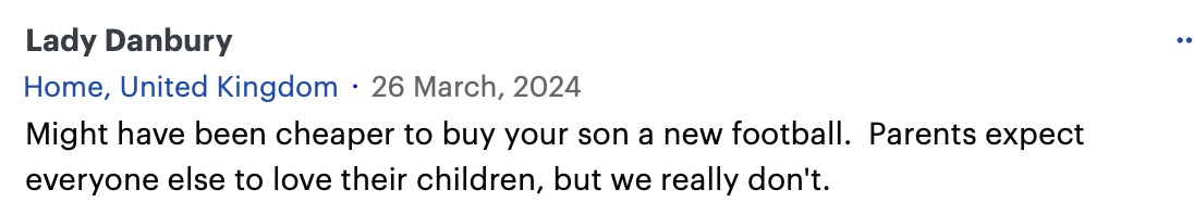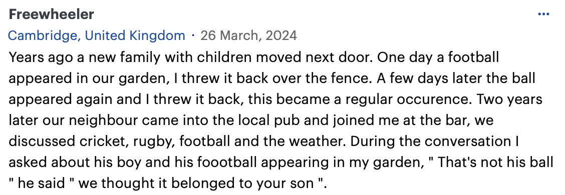 几年前,隔壁搬来了一个带着孩子的新家庭。一天,一个足球出现在我们的花园里,我把它扔了回去。几天后,球又出现了,我又把它扔了回去,这成了经常发生的事情。两年后,我们的邻居来到当地的酒吧,和我一起在酒吧里讨论板球、橄榄球、足球和天气。在谈话中,我问起他的儿子和他的足球出现在我的花园里的事,“那不是他的球,”他说,“我们以为那是你儿子的。” 也许给你儿子买个新足球更便宜。父母希望每个人都爱他们的孩子,但我们真的做不到。