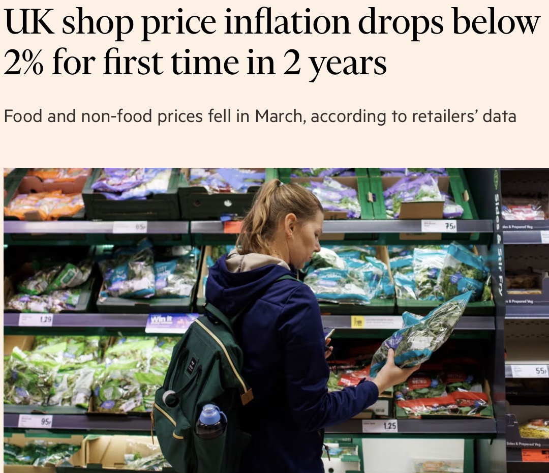 - 据金融时报报道,3月,英国商品价格通胀率两年来首次降至2%以下。这一迹象表明,过去两年的物价飙升即将结束。