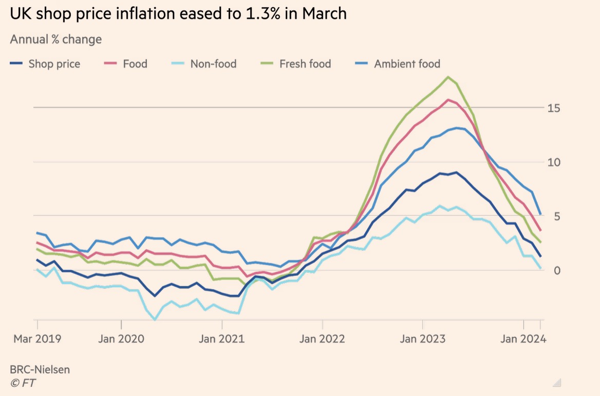 据金融时报报道,3月,英国商品价格通胀率两年来首次降至2%以下。这一迹象表明,过去两年的物价飙升即将结束。