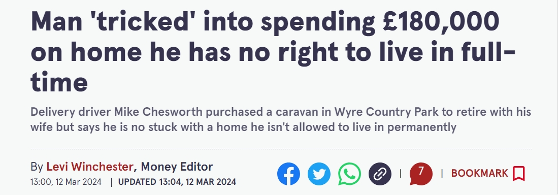除了Mike外,另外五名住在Wyre乡村公园的居民也表示,公园的场地所有者曾虚假地承诺他们可以一直住在公园里,但当他们后来投诉时,又受到被驱逐的威胁。