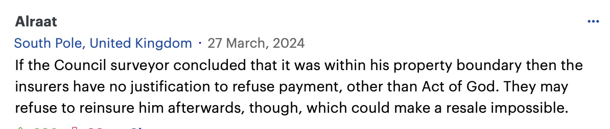 如果政府的测量员得出结论,认为它在他的财产范围内,那么保险公司没有理由拒绝付款,除非是天灾。不过,他们之后可能会拒绝为他再担保,这可能会使房产之后的转卖变得不可能。