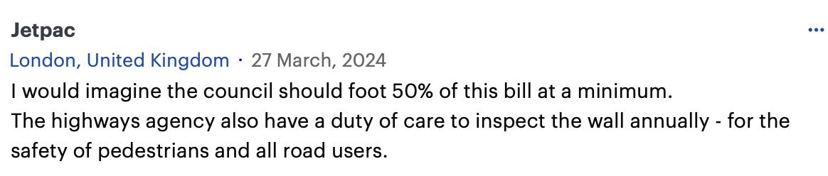 我觉得当地政府至少应该承担50%的费用。为了行人和所有道路使用者的安全,高速公路管理局也有义务每年检查这堵墙。