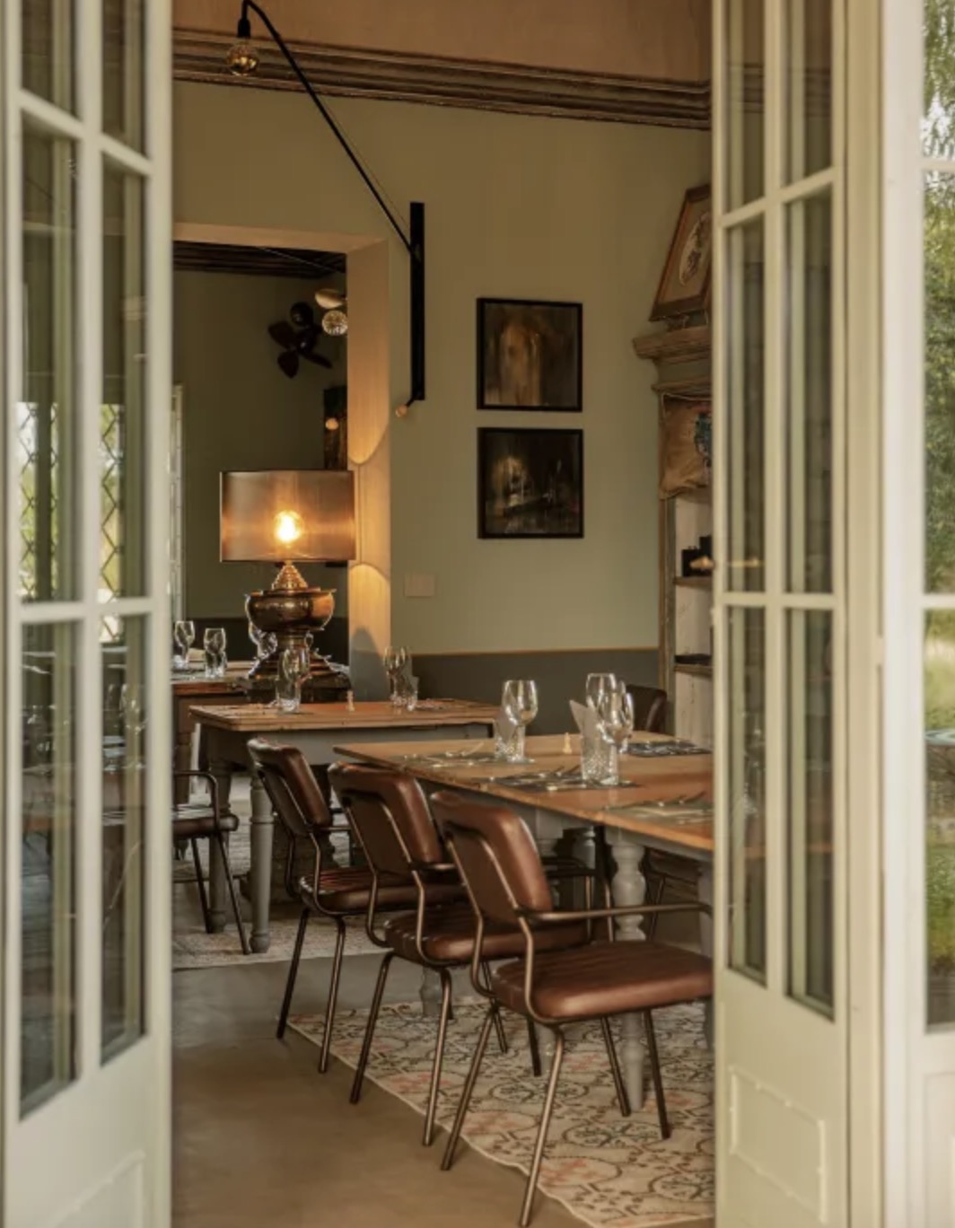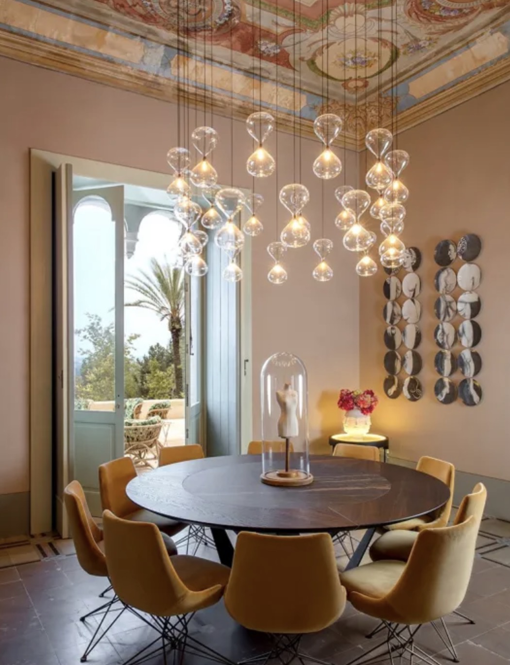 餐厅的天花板还保留着壁画。吊灯别具一格