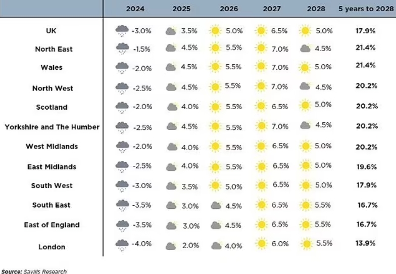 据Savills预测,截至2028年的五年内,英国平均房价将上涨17.9%。