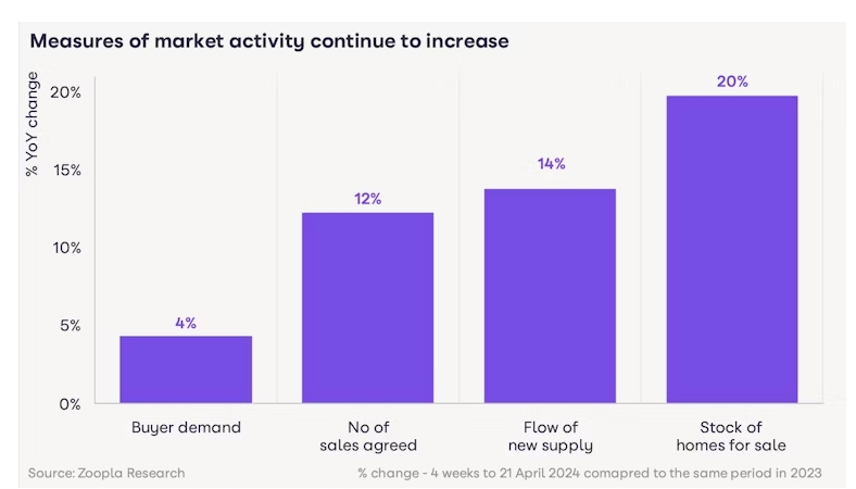 与此同时,供应量也在增加,在截至4月21日的四个星期内,待售房屋比2023年同期增加了14%,而Zoopla目前的实时库存量比去年同期增加了20%。