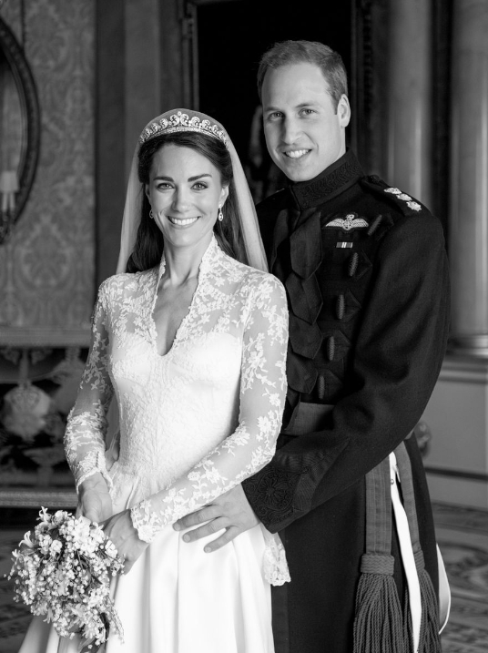 据悉,这张照片是他们在婚礼当天拍摄的,照片中凯特穿着Alexander McQueen品牌的连衣裙,而威廉则穿着爱尔兰卫队的束腰外衣,两人依偎在一起,看起来十分甜蜜。