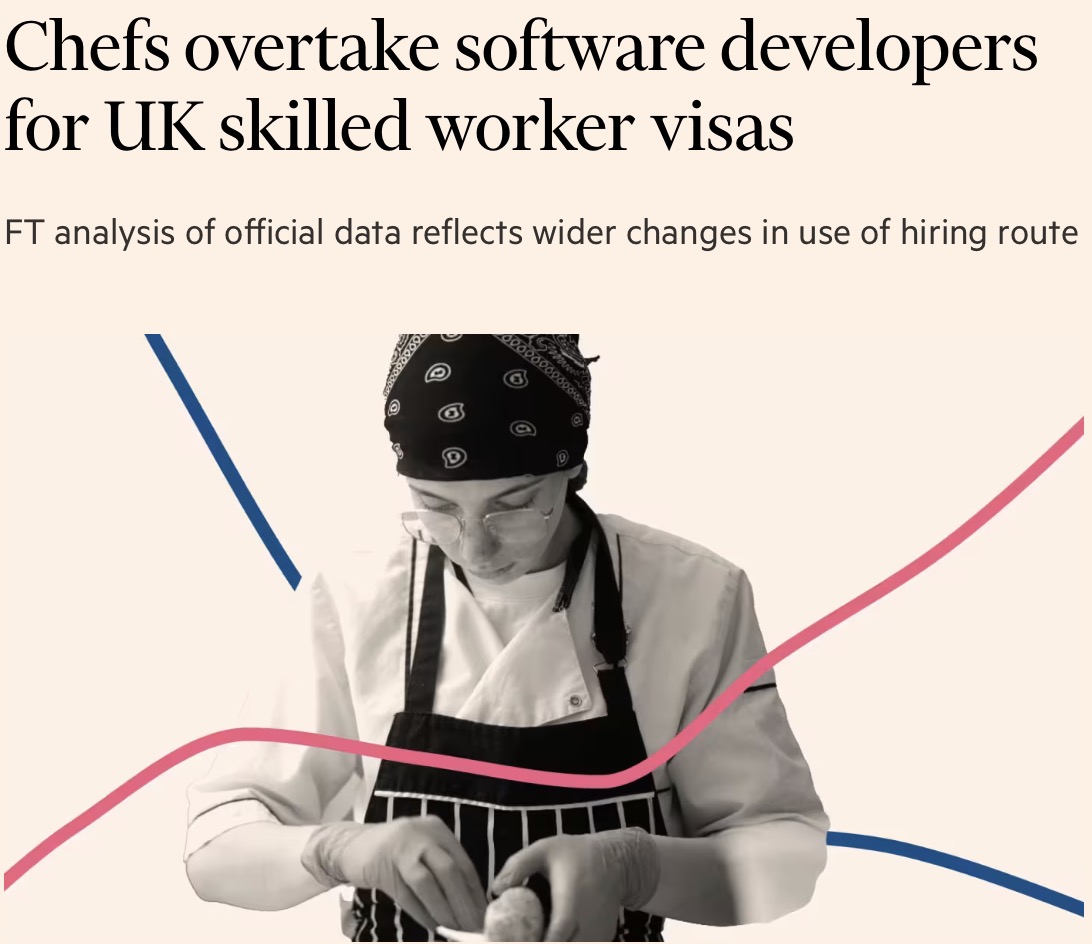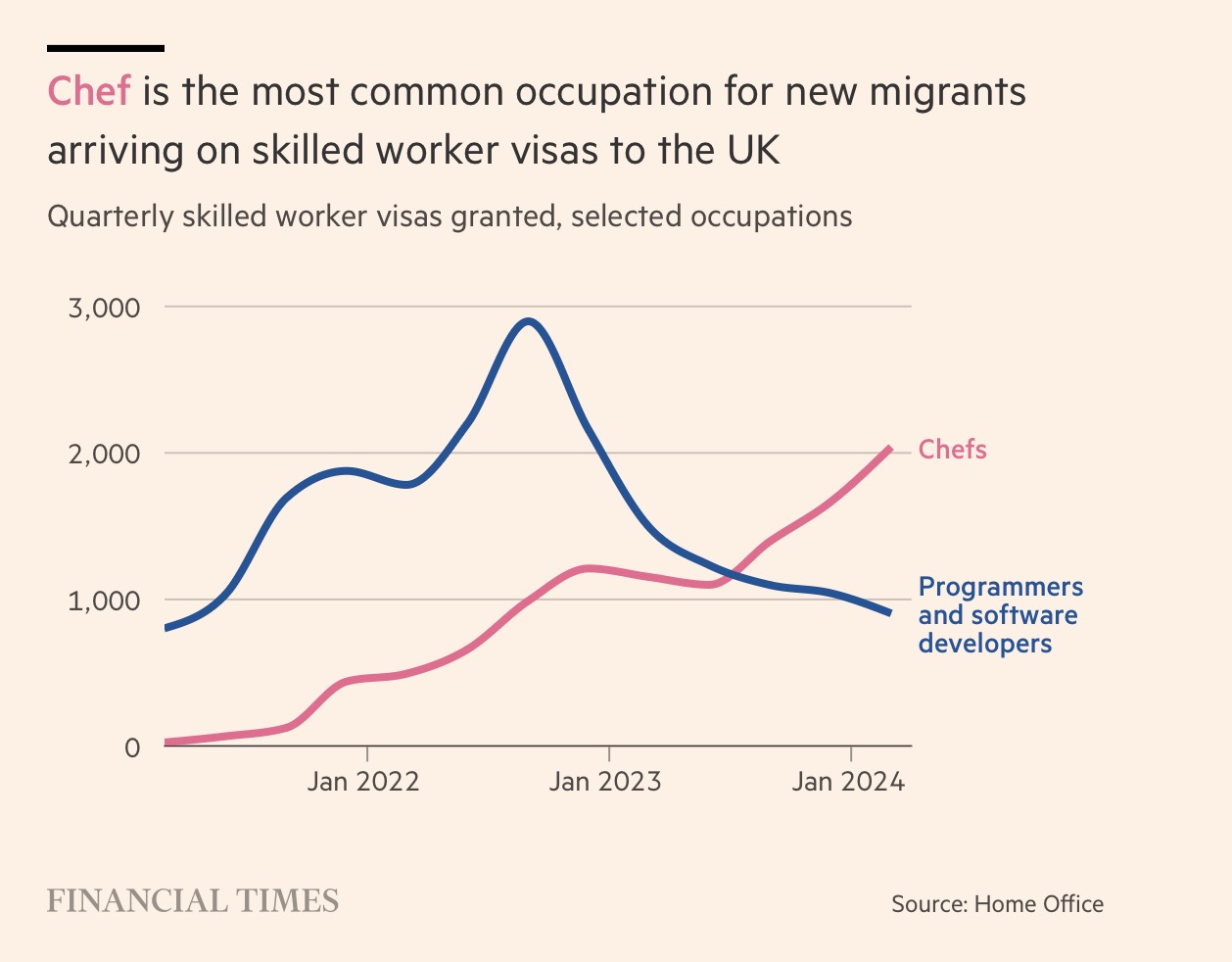 - 在申请英国技术工人签证方面,厨师已取代程序员,成为持技术工人签证抵达英国的移民最常见的职业。