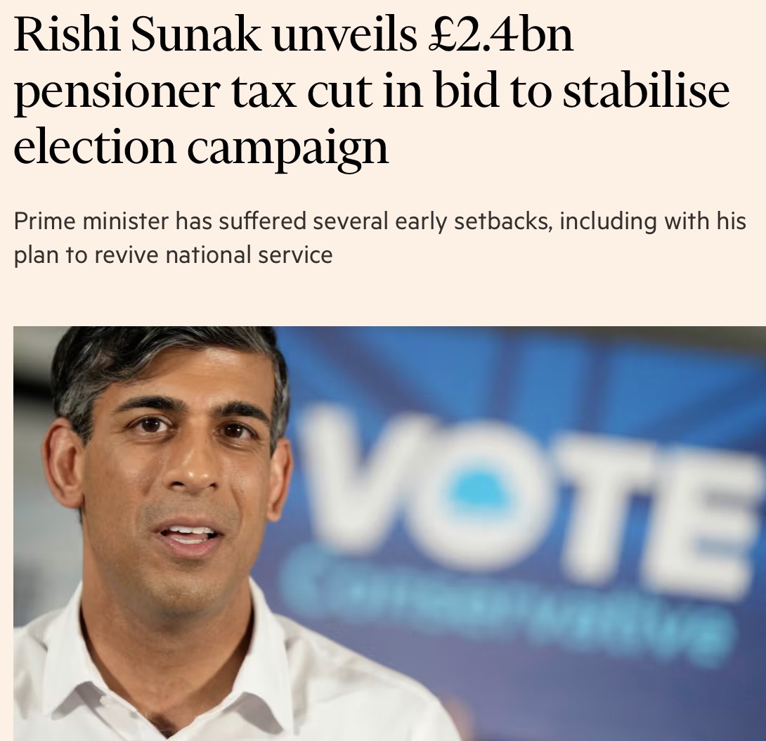 - 为拉选票,Rishi Sunak公布了24亿英镑的养老金减税计划。此举旨在支持关键的保守党“灰色选票”,并稳定保守党在大选伊始的混乱局面。
