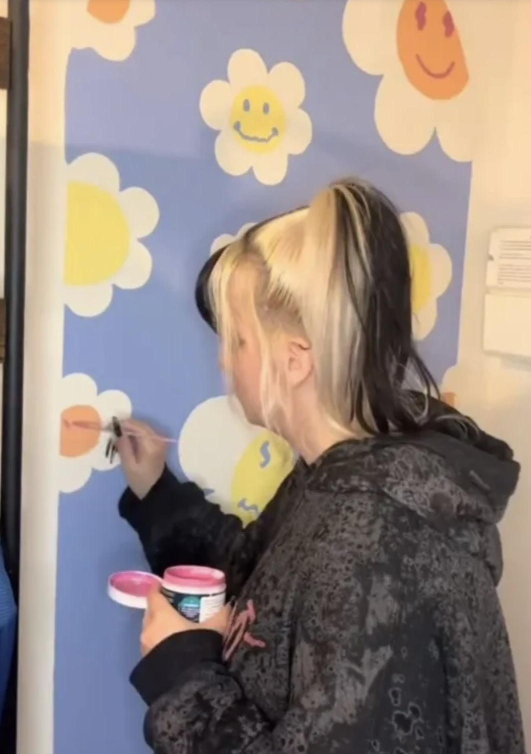墙壁上的花朵,绘画等,大多都是她自己动手完成的。