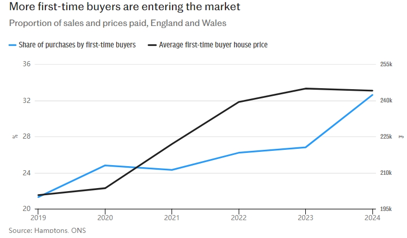 根据Hamptons的最新数据,今年首次购房者的购房量创下历史新高,上半年占所有房产购买量的三分之一。较2023年同期上升了6个百分点,达到32.6%。