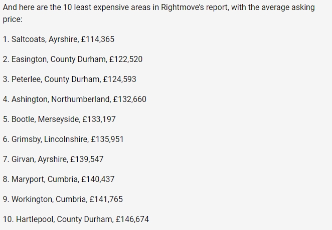 在最便宜的海滨热点排行榜中,达勒姆郡(Durham)的Easington的平均要价排在第二(均价122,520 英镑),该地区的Peterlee排名第三(均价124,593 英镑)。