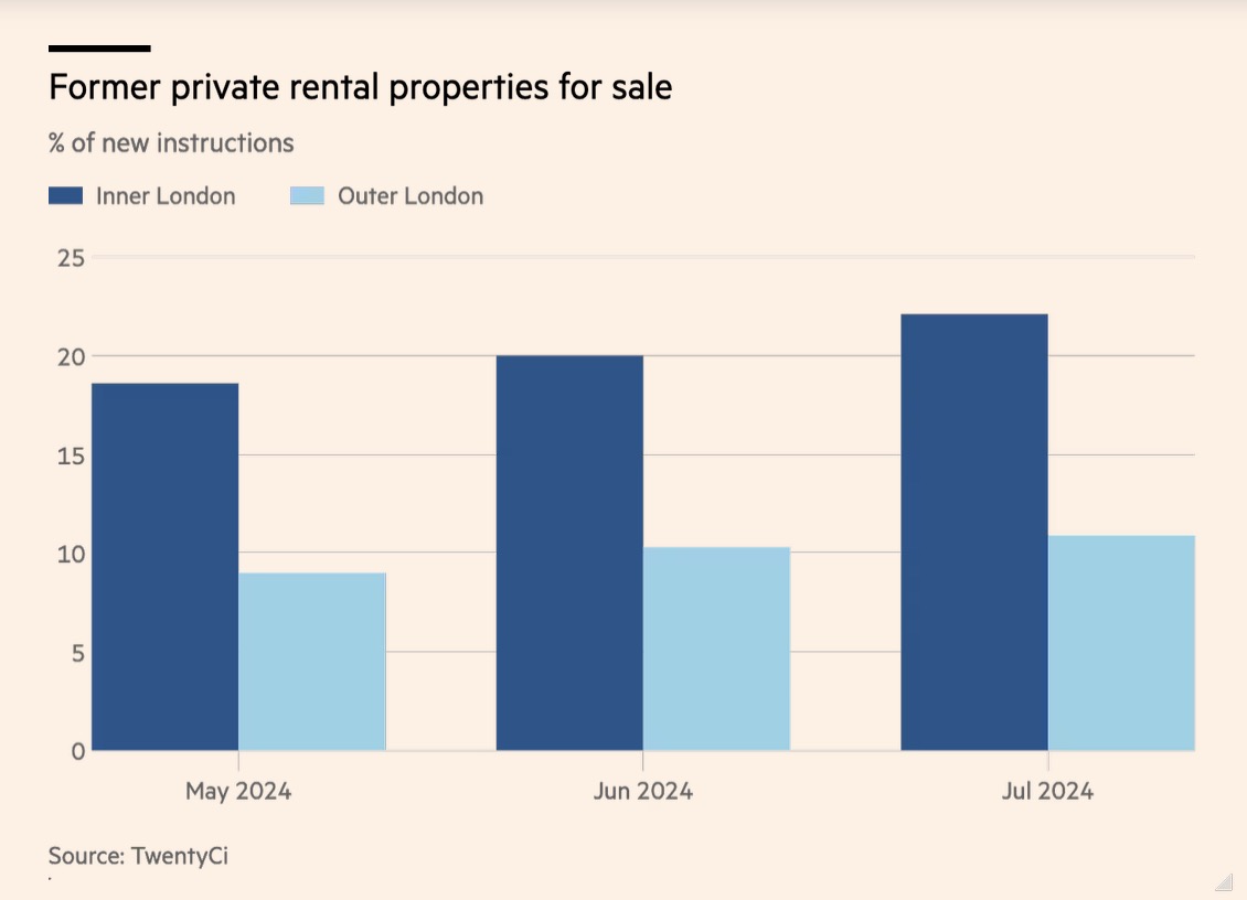 2024年7月,过去10年曾在市场上出租过一段时间的伦敦出租房上市出售的房产,在伦敦所有房产中占比22%,这是过去10年来的最高水平,而英国其他地区,这一比例仅为9%左右。