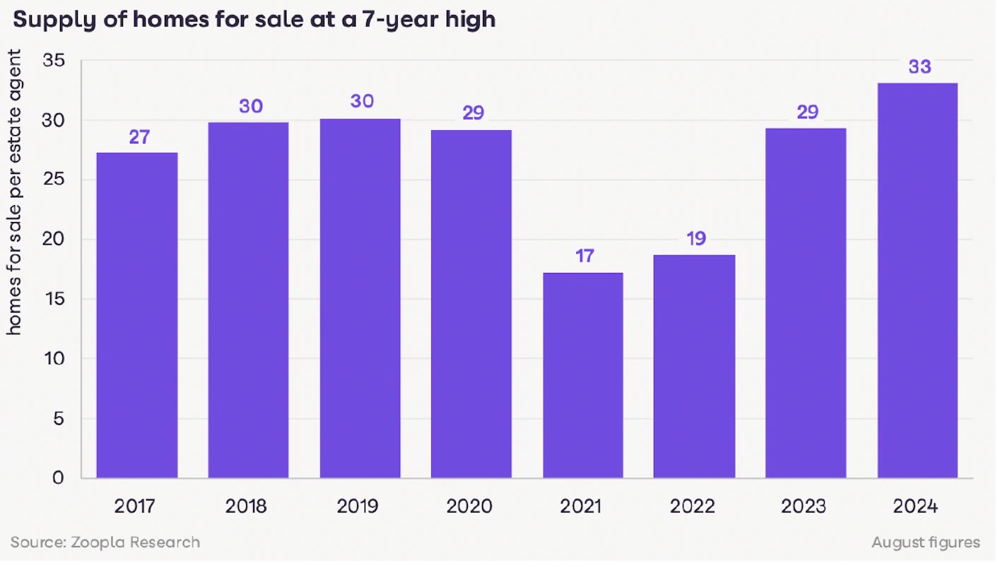 目前,Zoopla 上的房地产经纪人平均挂牌数量为33 处未售房产,这是自 2017 年以来的最高水平。