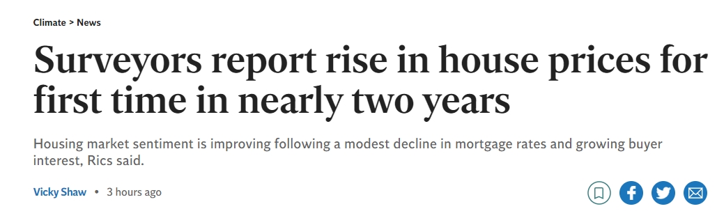 英国皇家特许测量师学会 (RICS) 表示,随着市场活动的回暖,房价近两年来首次出现上涨迹象。