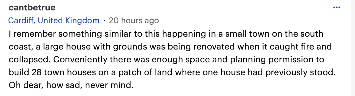 我记得类似的事情发生在南海岸的一个小镇上,一栋带庭院的大房子正在装修,突然着火倒塌了。这里有足够的空间和规划许可,可以在原来只有一栋房子的地方建造28栋联排别墅。哦,亲爱的,多么伤心,没关系。