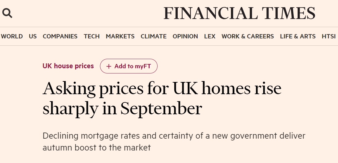 由于大选后政治日趋稳定,以及抵押贷款利率下降推动买家需求反弹,9月份英国房产要价创历史新高,上涨速度是长期平均水平的两倍。