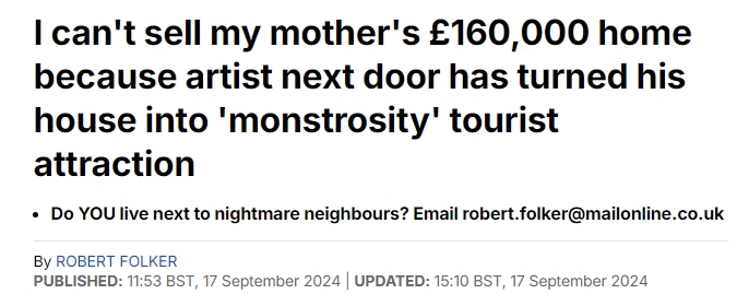他说:“我们需要卖掉妈妈的房子来支付她的护理费用。这套房子上市几个月了,但因为隔壁不好看所以一直没卖出去。每个看过的人都喜欢我们的房子——但邻居的艺术行为让他们打消了买房的念头。”