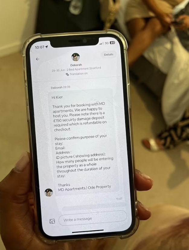 Rohann认为Airbnb也应该承担一定的责任,他甚至尝试在Airbnb上预订自己的公寓,并收到了一家名为MD Management的公司发来的消息,该公司要求他支付150英镑的押金。