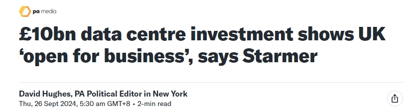 - 黑石集团将投资100亿英镑在英建设新人工智能数据中心,这将创造4,000个就业岗位,并表明英国对商业持“开放”态度…