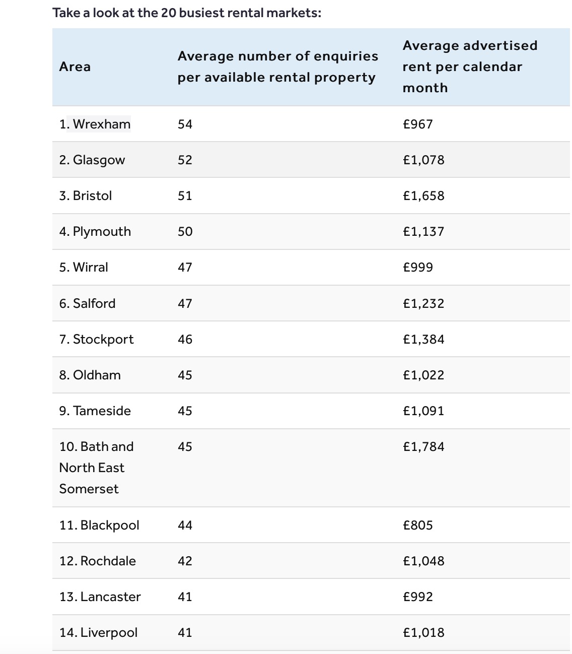 其中,Wrexham的租房需求最旺盛,平均一套出租房有约54名租房者求租。