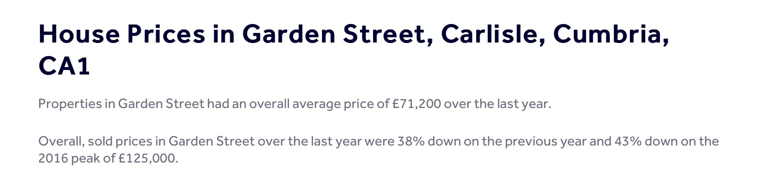 去年,卡莱尔花园街道的房产售价7.12万镑,较之前一年下降了38%,比2016年12.5万英镑的峰值价格下降了43%。