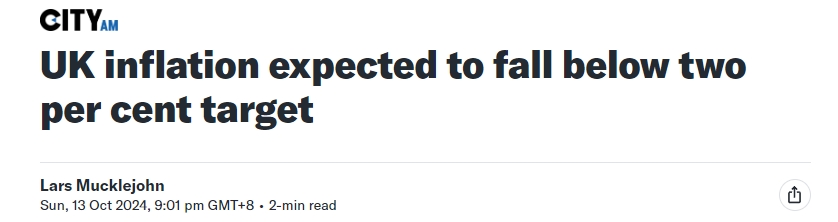 外界预计,随着通胀率自2021年4月以来首次跌破设定目标,这可能导致英国央行在11月的下次会议中降低借贷成本。