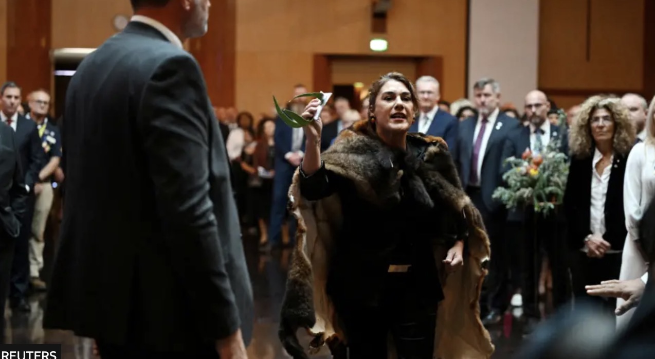 澳大利亚土著妇女利迪亚·索普(Lidia Thorpe)大喊了差不多一分钟,打断了仪式,随后被安全人员护送离开。