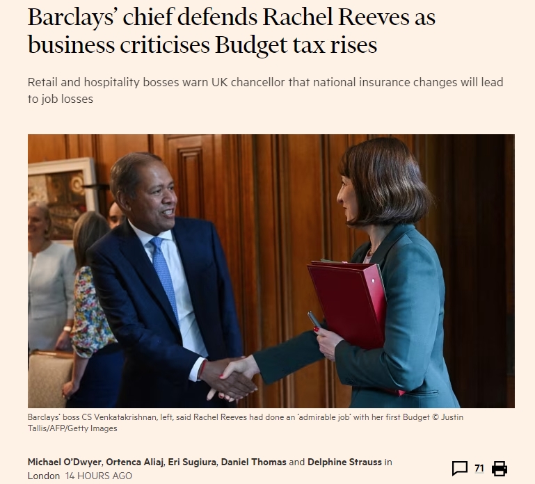 不仅如此,巴克莱银行首席执行官CS Venkatakrishnan也公开为增税预算进行辩护。
