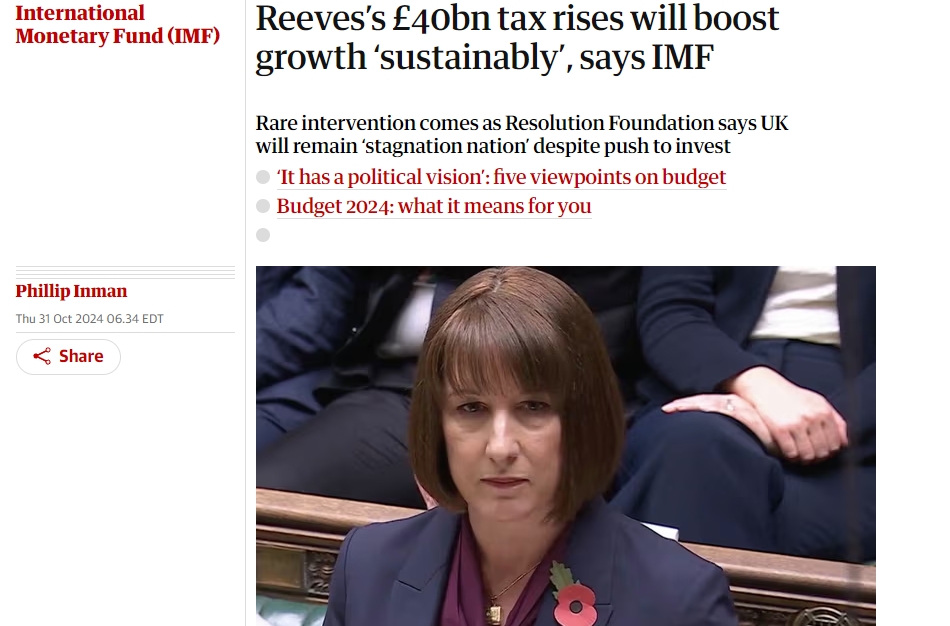 在里夫斯发言之际,国际货币基金组织(IMF)对英国的秋季预算做出认可,并表示:“我们支持中期削减赤字的设想,这将促进经济可持续的增长。”