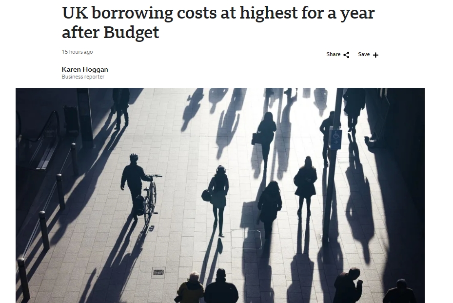 受周三预算影响,英国政府借贷成本已升至一年多以来的最高水平。