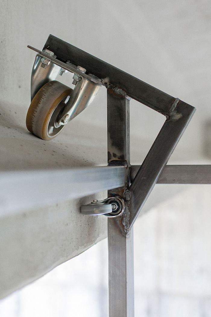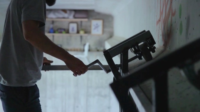 整个工作室都是悬空的,因此Fernando设计了一个手摇轨道来移动